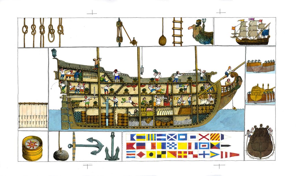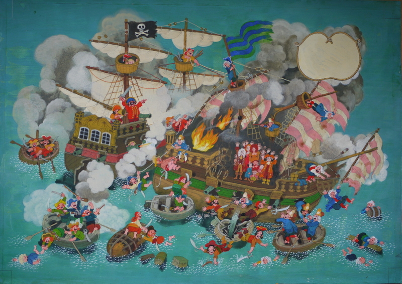 Ali Mitgutsch Das große Piraten-Wimmelbuch_Isola del tesoro, anni ’70 Rund ums Schiff – Dentro la nave, anni ’70 Das große Piraten-Wimmelbuch_Battaglia navale, anni ’70