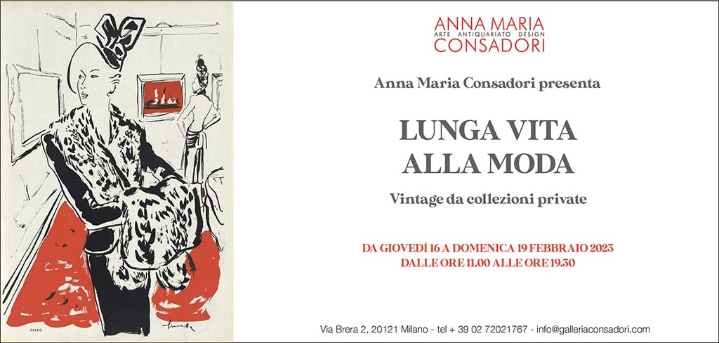 La Galleria Consadori ospita in via eccezionale una vendita di raffinati vestiti e accessori vintage. Questi abiti, sia di storiche firme italiane e internazionali sia di ricercate sartorie milanesi, indossati da collezioniste, amiche e clienti della galleria, avranno l’occasione di essere nuovamente indossati.